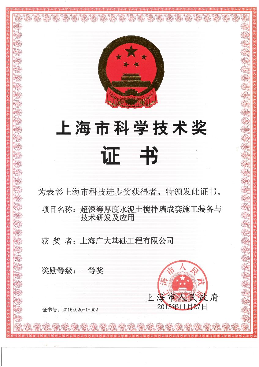 上海廣大基礎工程有限公司是一家集科研、施工為一體的具有專業特色的大型施工企業,具有地基基礎工程專業承包一級資質,上海市高新技術企業,上海市建筑施工行業協會會員單位、上海市土木工程學會團體會員、上海市SMW工法協會常務理事單位、TRD工法協會會長單位、大直徑高壓旋噴樁協會會員單位、靜鉆根植樁技術發展研究會副會長單位、微擾動四軸攪拌樁(DMP工法)研究會會員單位。